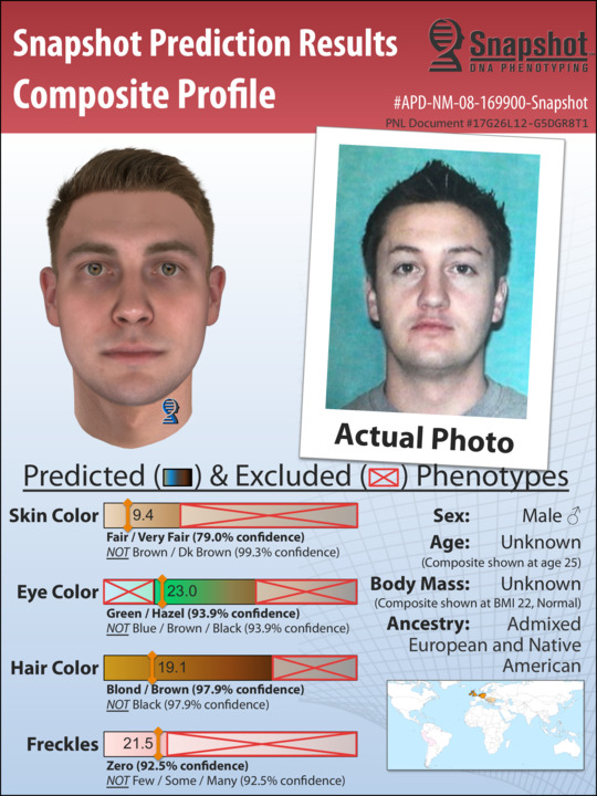 Upon reviewing Snapshot Report #APD-NM-08169900, Det. Gonterman knew she needed to talk to Hansen. Snapshot predicted the perpetrator was European with minor Native American admixture, fair skinned, with brown hair and green or hazel eyes. Det. Gonterman later reported, "We had one person on the list with brown hair and green eyes, and his name was Justin Hansen. His resemblance to the Snapshot composite could not be ignored." Within days, Gonterman and her partner met Hansen at his residence.